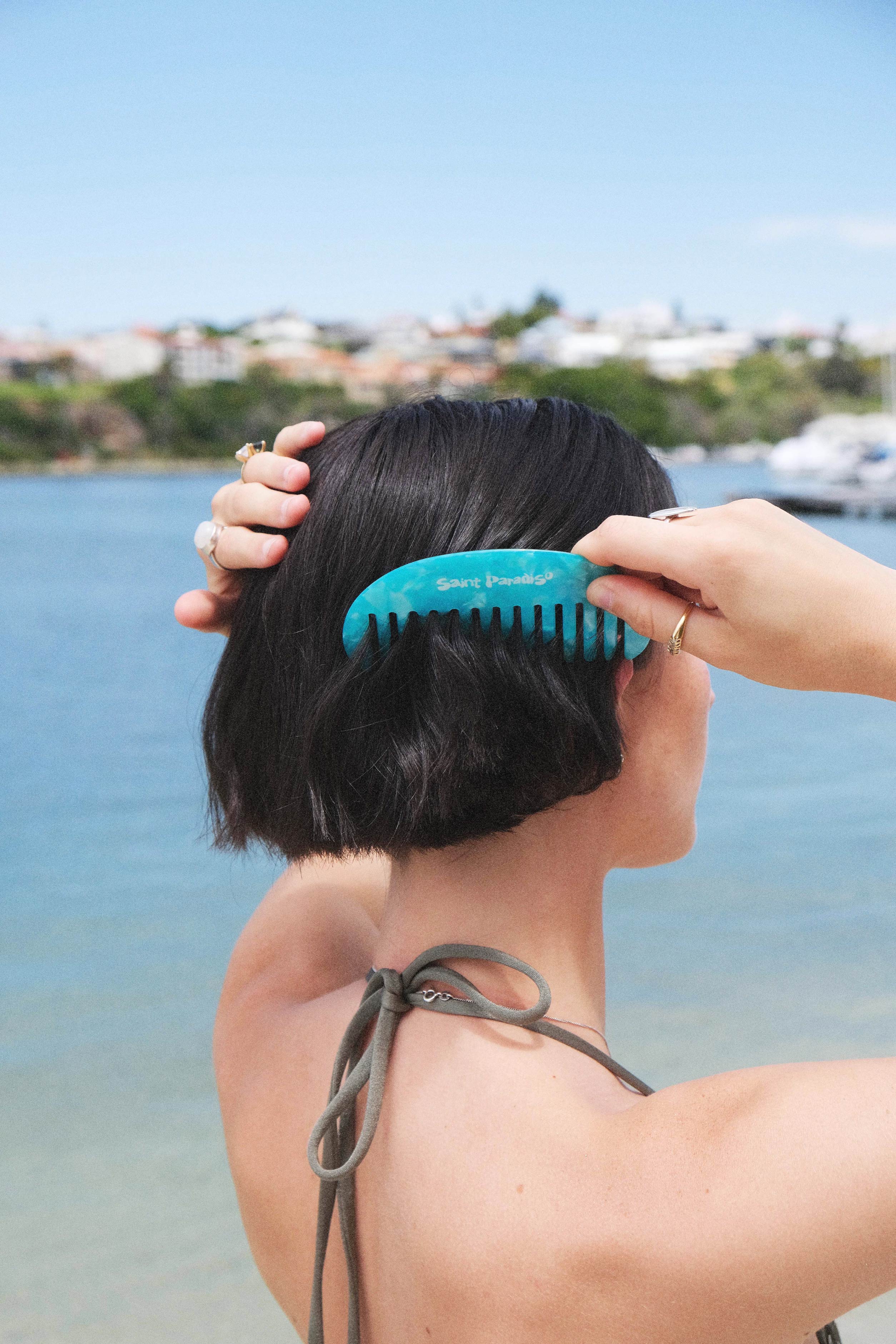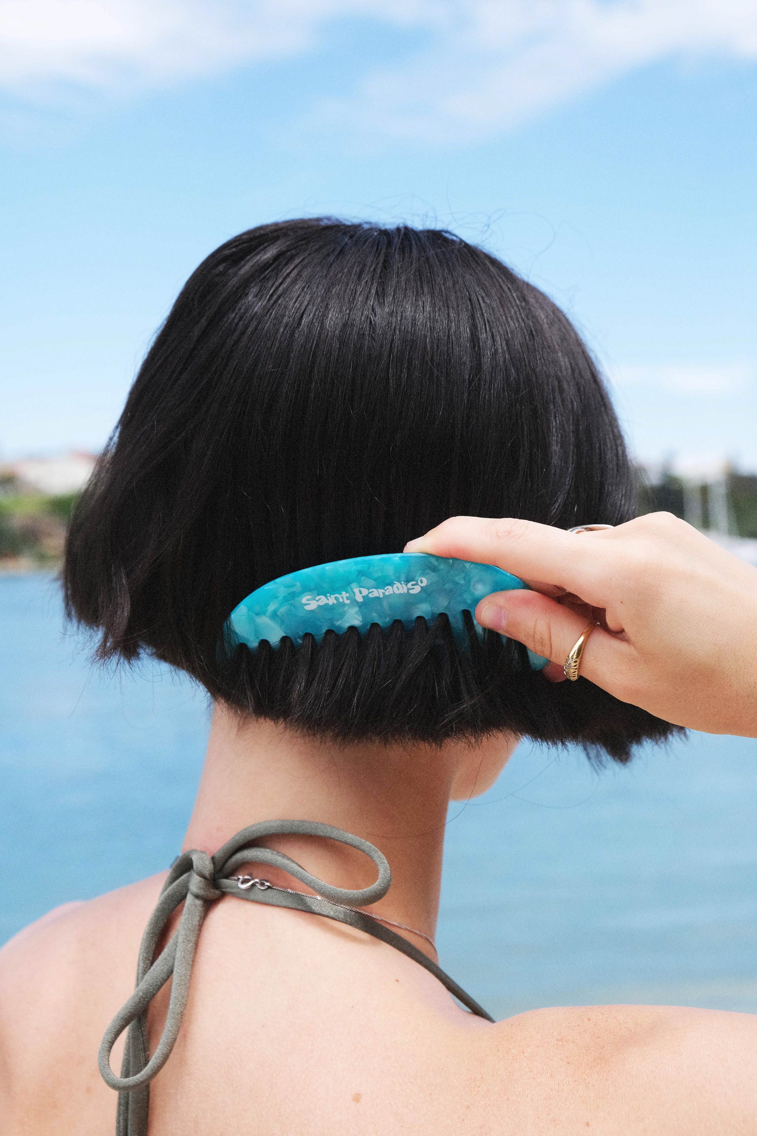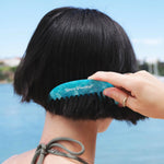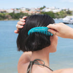 Wide tooth detangling beach comb in crystal blue colourway. Made to look after your hair pre and post swim this summer.