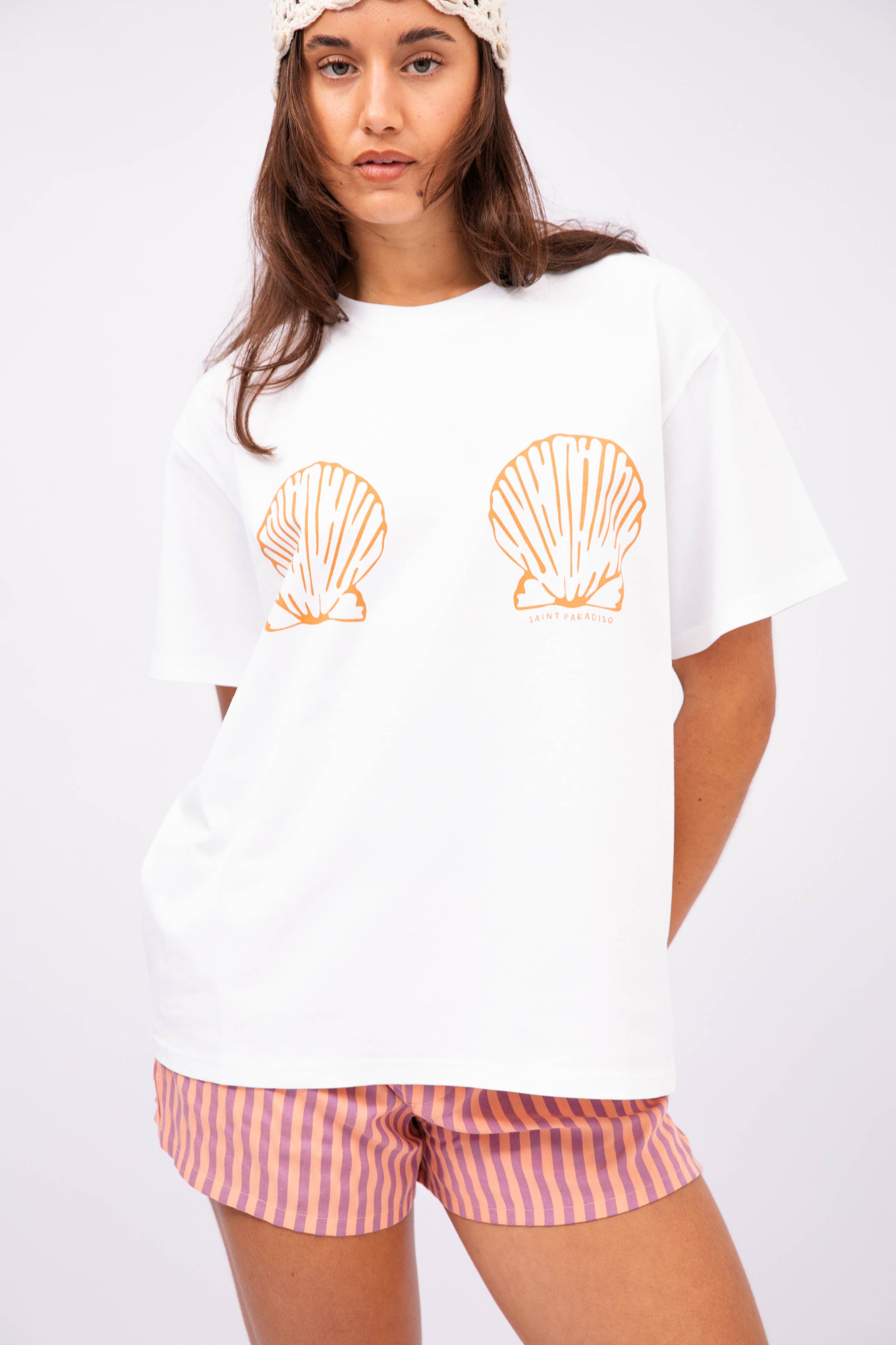 Say hello to the new Shell Boyfriend Tee in White and Orange from our Endless Summer Collection. Made from 100% cotton, wear her over your bathers to the beach or on your morning coffee run!