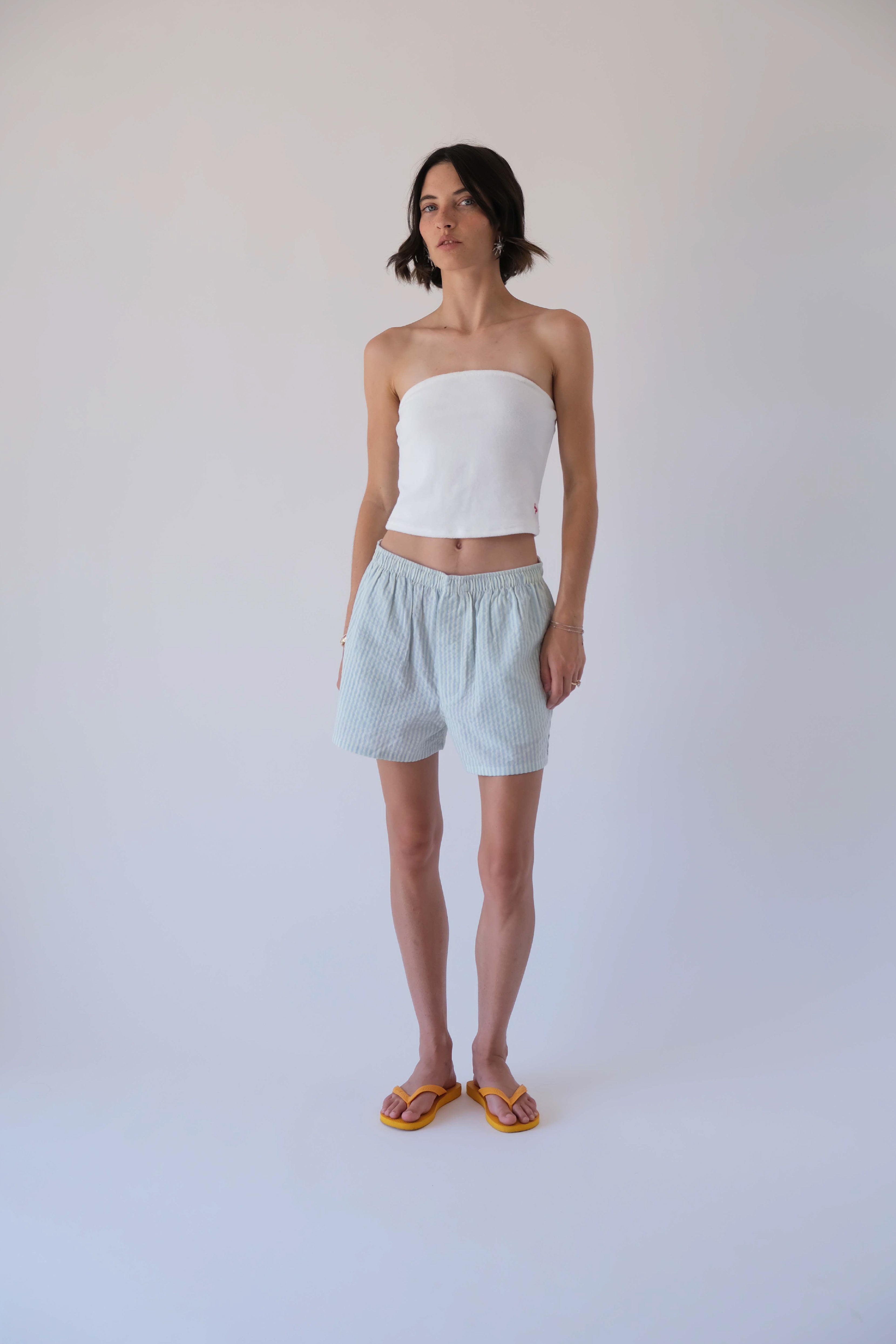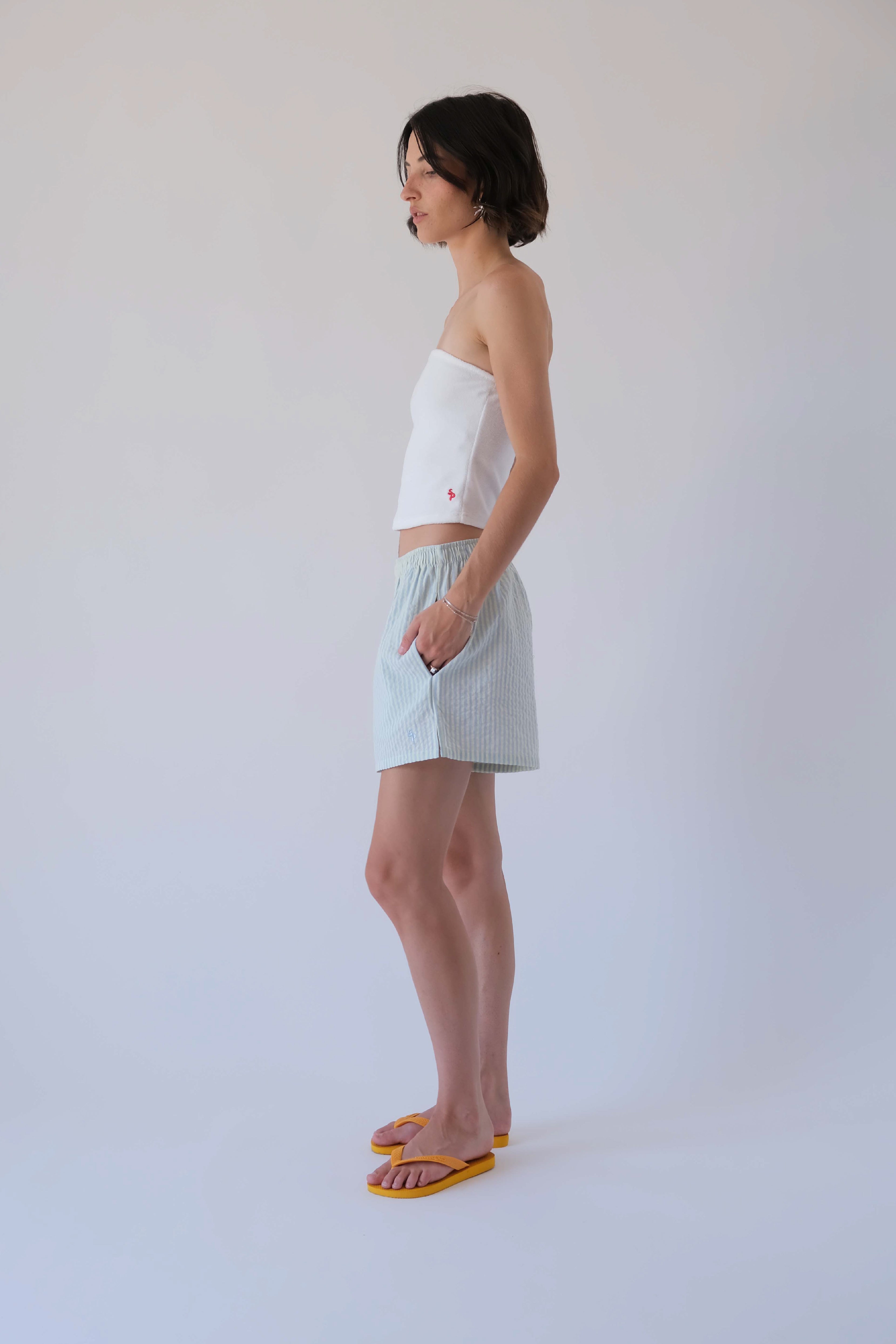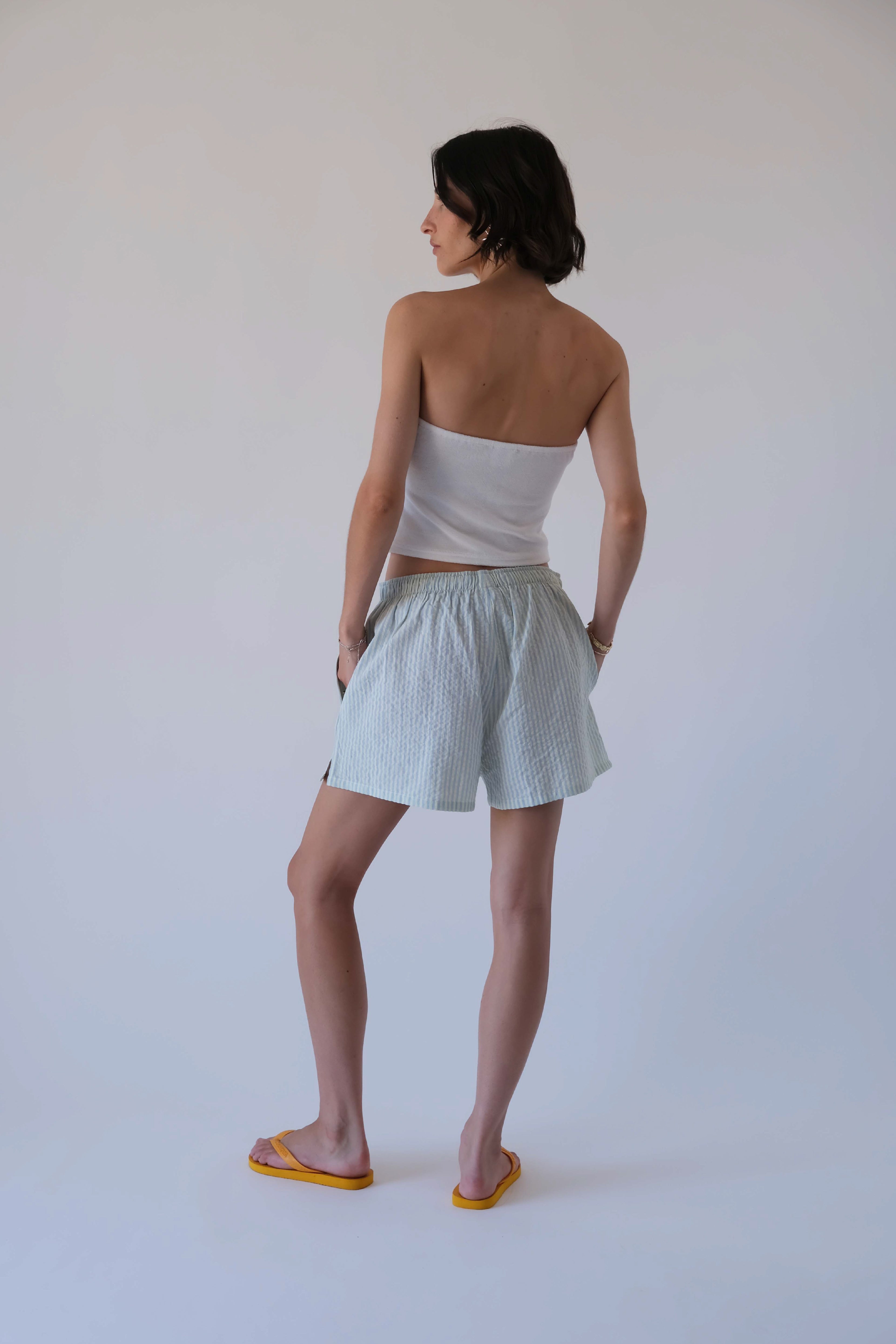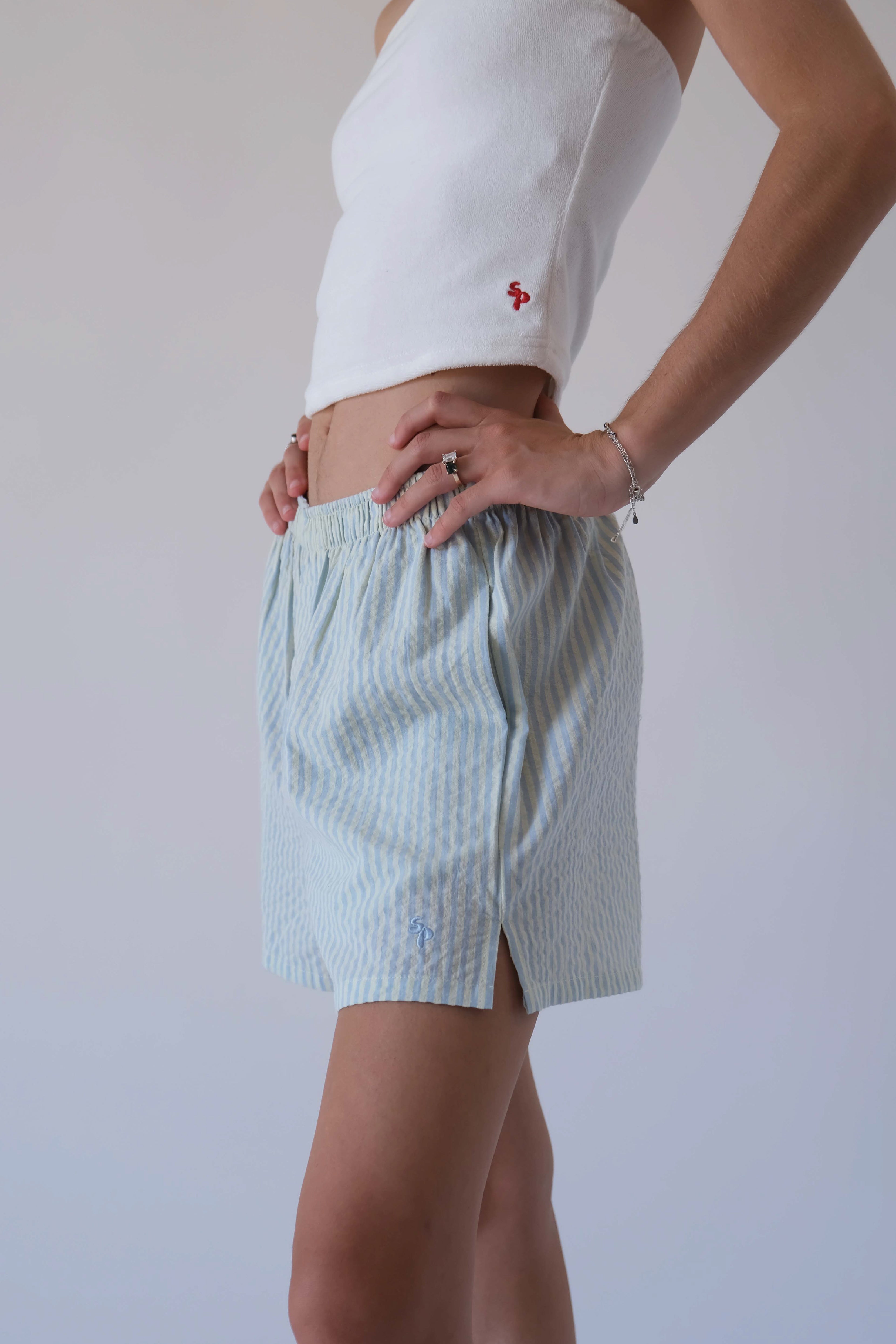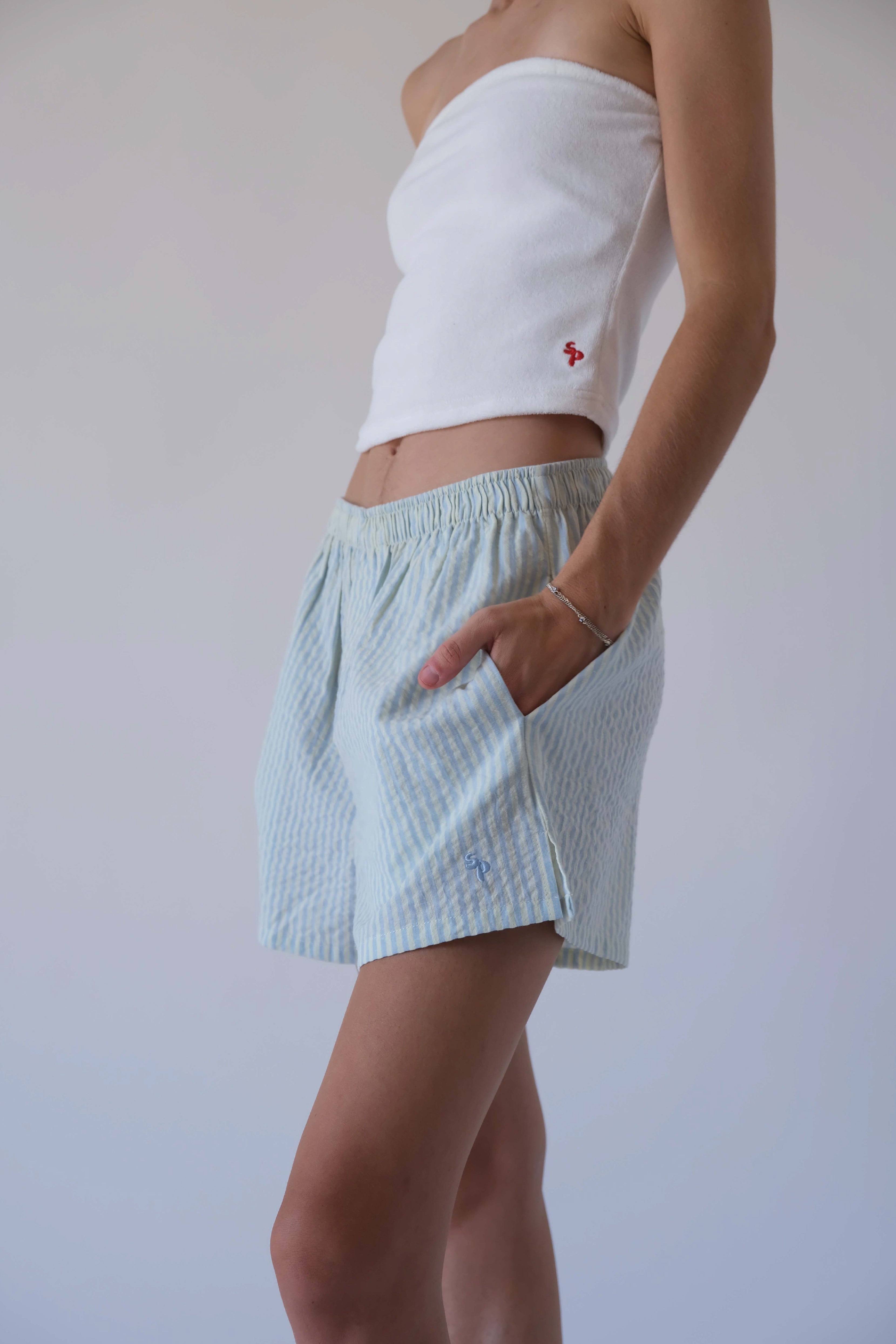 Welcoming our new SP Boxer Short, made from a lightweight, seersucker textured 75% cotton 25% Polyester fabric in a pastel green and yellow stripe, featuring our signature SP logo delicately embroidered on the front.