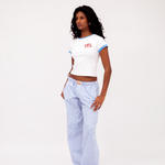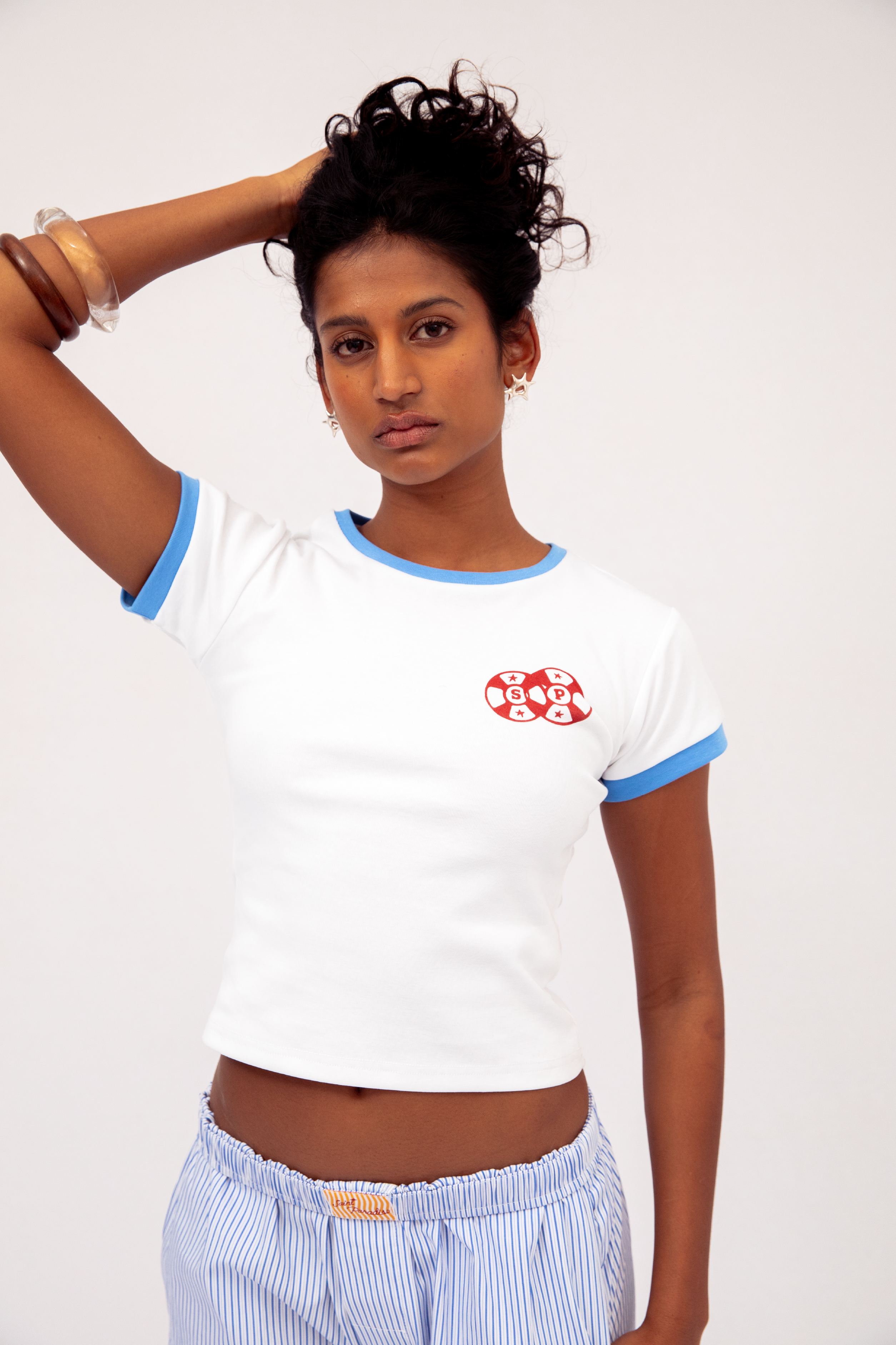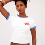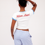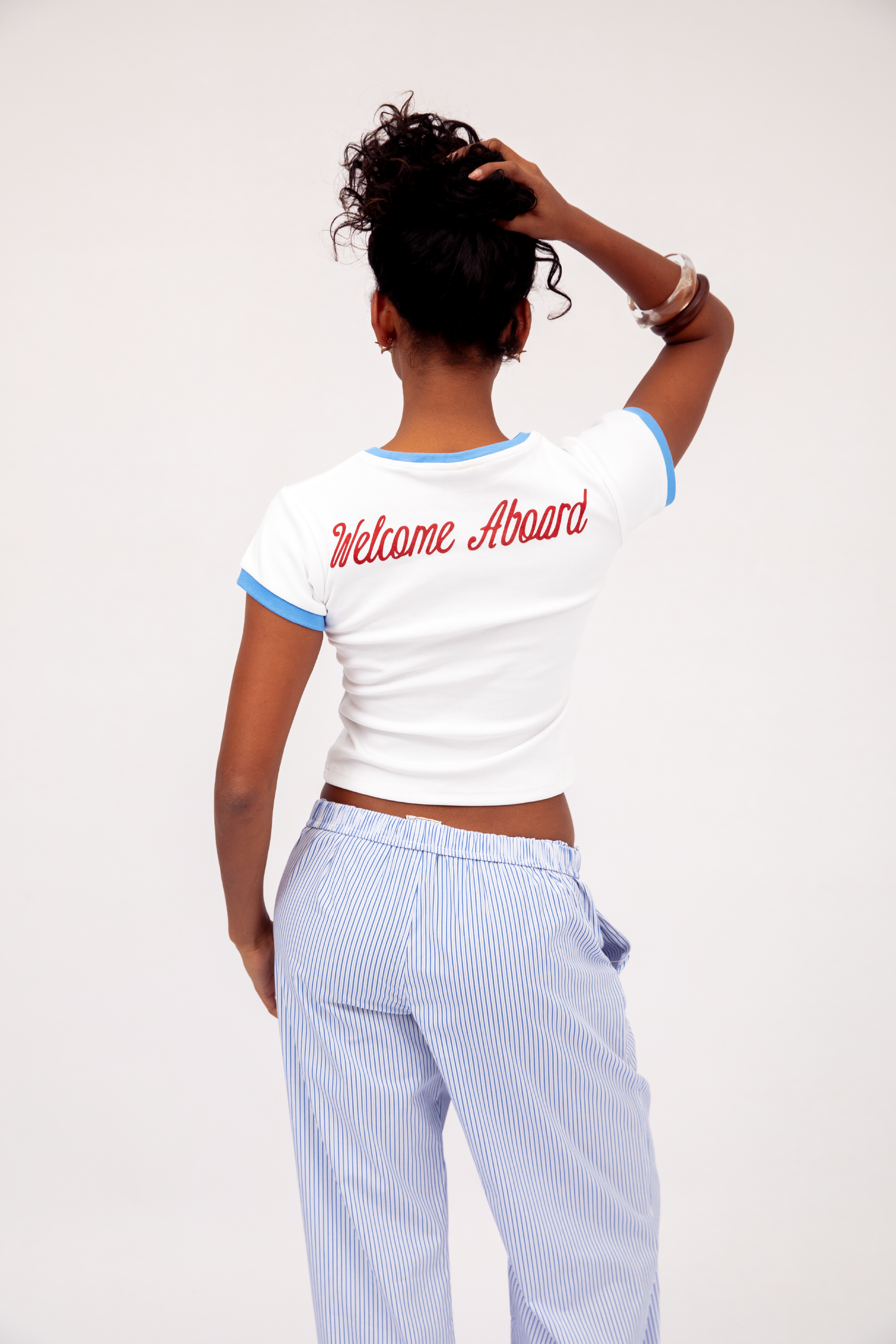 Say hello to your next everyday obsession. The Welcome Aboard Ringer Tee is a cotton ribbed baby tee featuring a mini buoy graphic on the front and bold “Welcome Aboard” script across the back, it’s giving retro charm meets holiday energy. Pair with your go-to boxers or wide-leg pants and you're officially on island time.